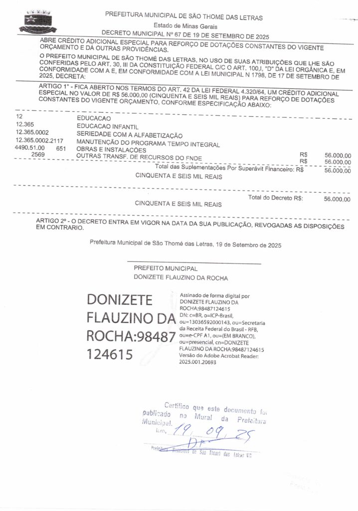 DECRETO 67/2025- ABRE CRÉDITO ADICIONAL ESPECIAL PARA REFORÇO DE DOTAÇÕES CONSTANTES DO VIGENTE ORÇAMENTO E DÁ OUTRAS PROVIDÊNCIAS. Início / Notícia /