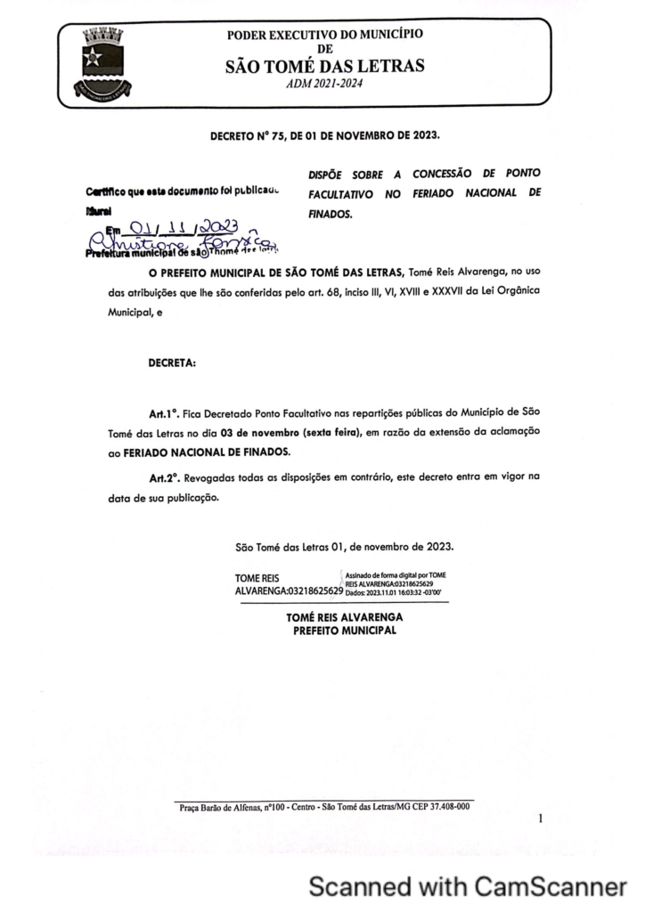 DECRETO 75 – DISPÕE SOBRE A CONCESSÃO DE PONTO FACULTATIVO NO FERIADO NACIONAL DE FINADOS Início / Notícia /