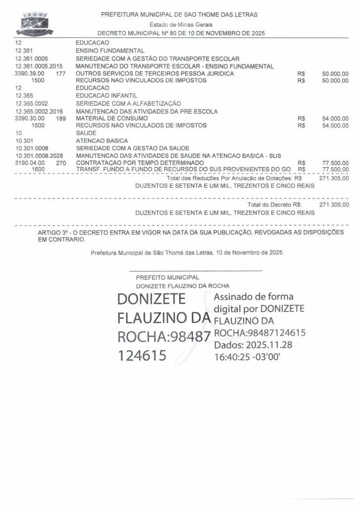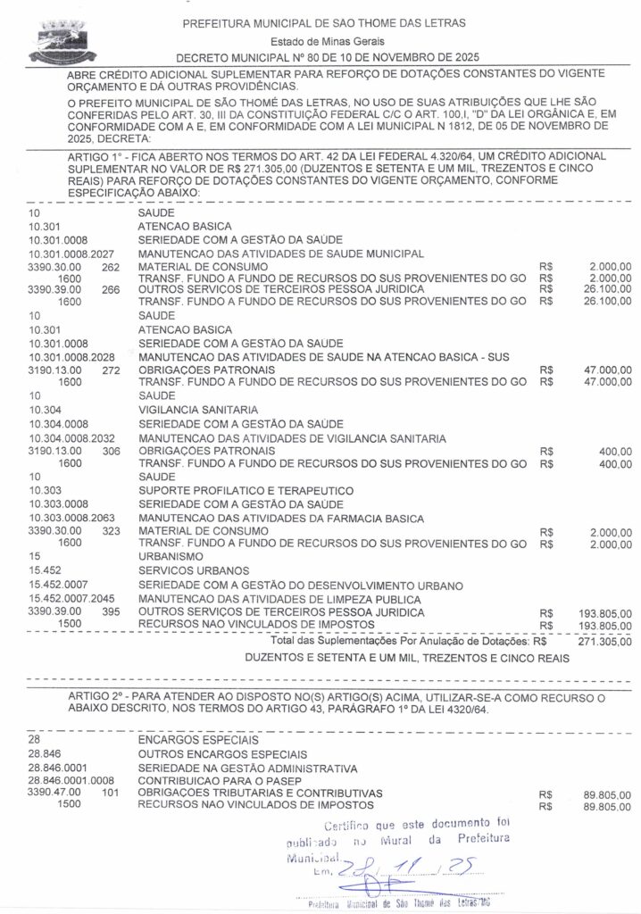 DECRETO 80 – ABRE CRÉDITO ADICIONAL SUPLEMENTAR PARA REFORÇO DE DOTAÇÕES CONSTANTES DO VIGENTE ORÇAMENTO E DÁ OUTRAS PROVIDÊNCIAS