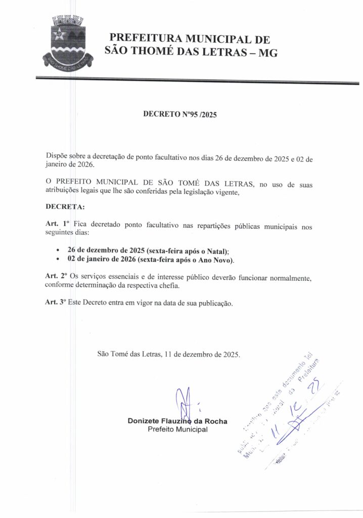 DECRETO 95/2025 – DISPÕE SOBRE PONTO FACULTATIVO NOS DIAS 26/12 E 02/2026 (NATAL E ANO NOVO)