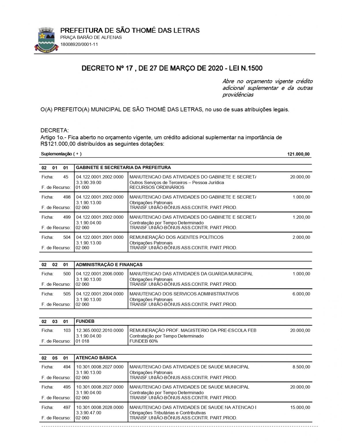 DECRETA ; Artigo 1 – Fica Aberta no orçamento Vigente, um credito adicional Suplementar na Importância de R$121.000,00 Distribuídos as seguintes Dotações em anexo em PDF.