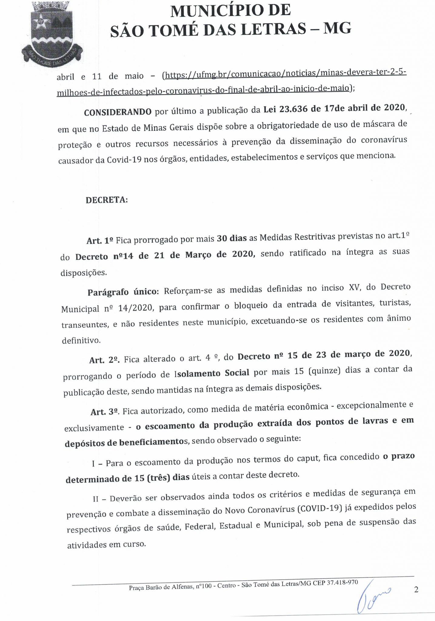 - Art. 1º Fica prorrogado por mais 30 dias as Medidas Restritivas prevista no Art.1º do Decreto nº14 de 21 de Março de 2020, sendo Ratificado na íntegra as suas disposições.