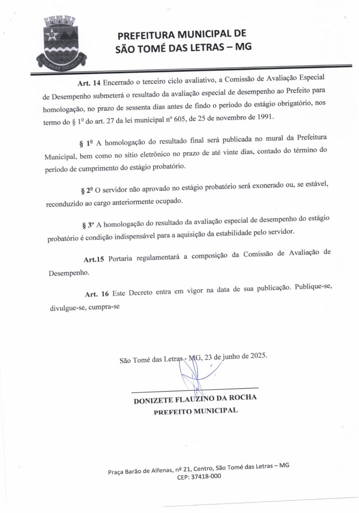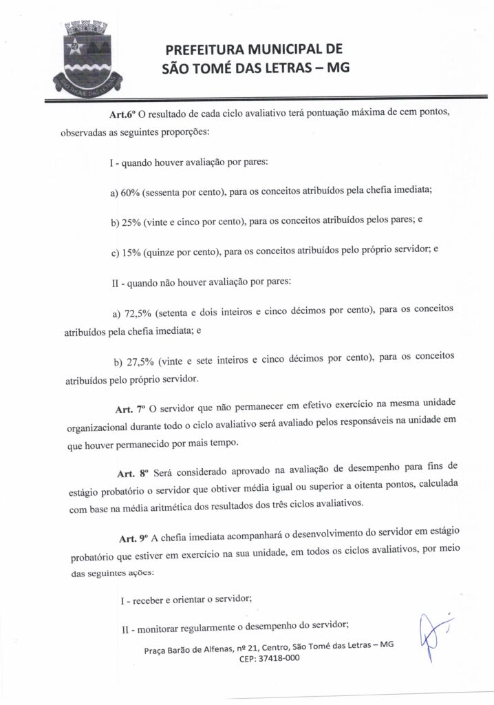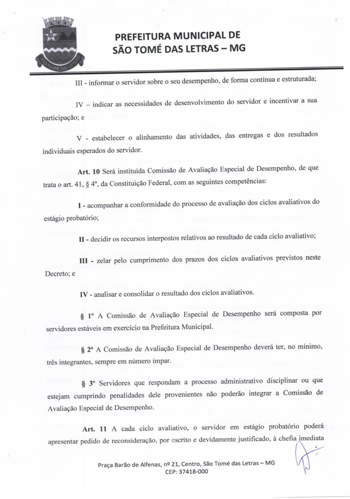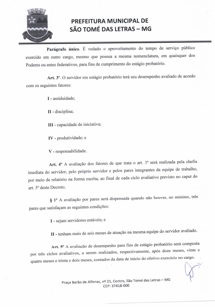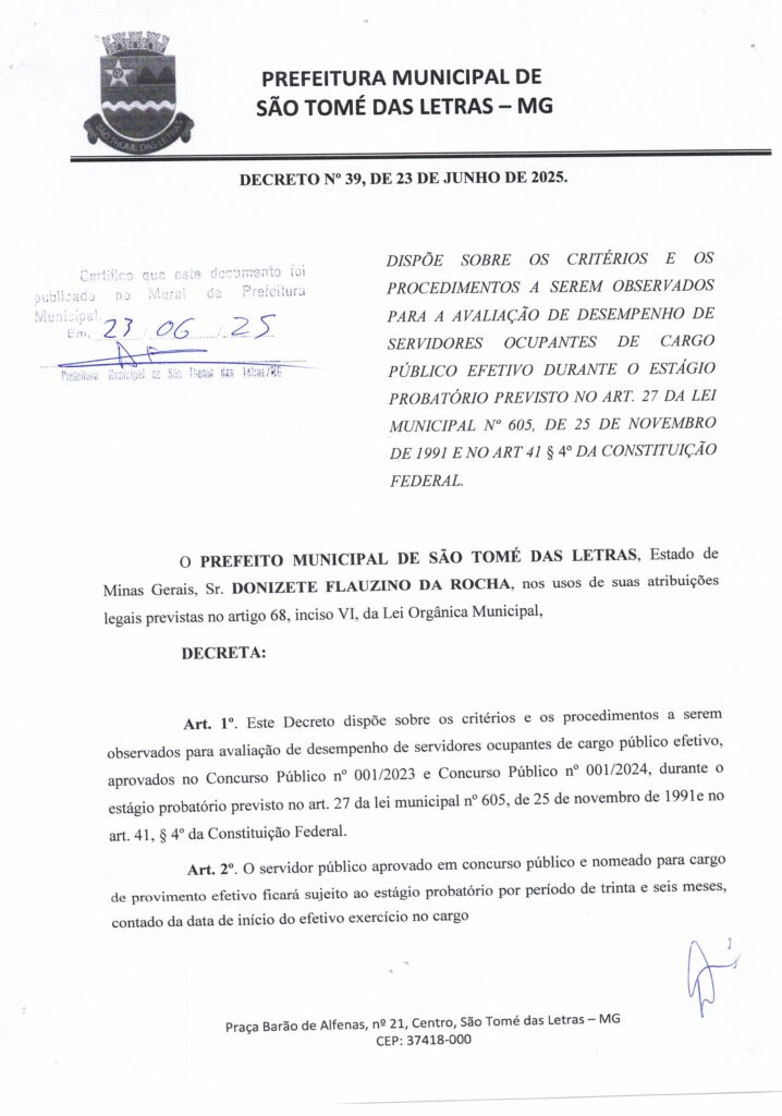 DECRETO Nº39 – DISPÕE SOBRE OS CRITÉRIOS E OS PROCEDIMENTOS A SEREM OBSERVADOS PARA AVALIAÇÃO DE DESEMPENHO DE SERVIDORES OCUPANTES DE CARGO PÚBLICO EFETIVO DURANTE O ESTÁGIO PROBATÓRIO PREVISTO NO ART Nº27 DA LEI MUNICIPAL Nº605 DE 25 DE NOVEMBRO DE 1991 E NO ART Nº41 SS DA 4º DA CONSTITUIÇÃO FEDERAL