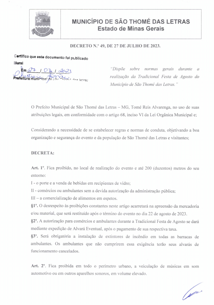 DISPÕE SOBRE AS NORMAS GERAIS DURANTE A REALIZAÇÃO DA TRADICIONAL FESTA DE AGOSTO DE SÃO THOMÉ DAS LETRAS 2023 Início / Notícia /