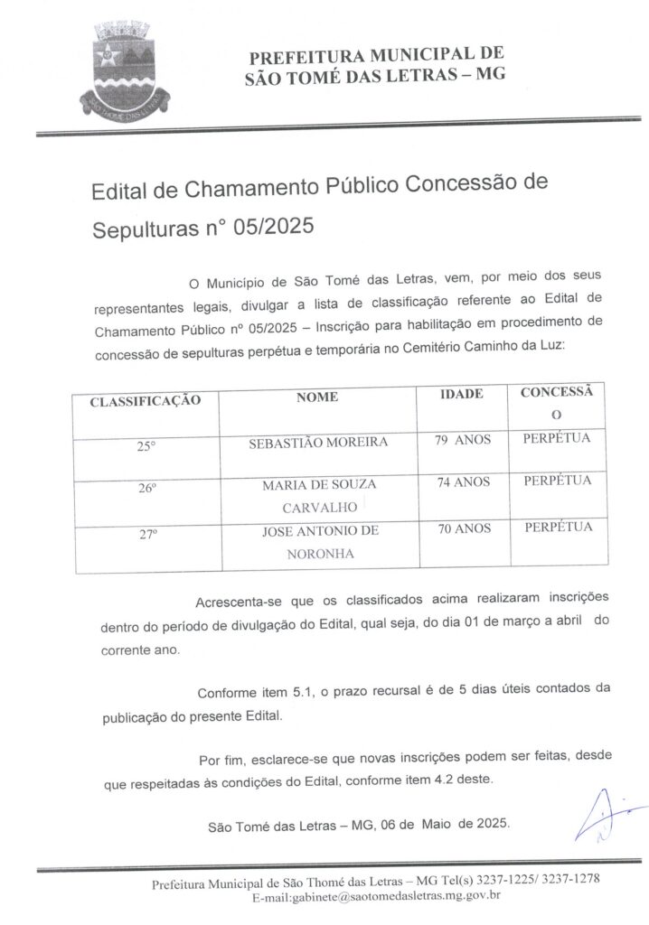 EDITAL 05/2025 – EDITAL DE CHAMAMENTO PÚBLICO CONCESSÃO DE SEPULTURAS
