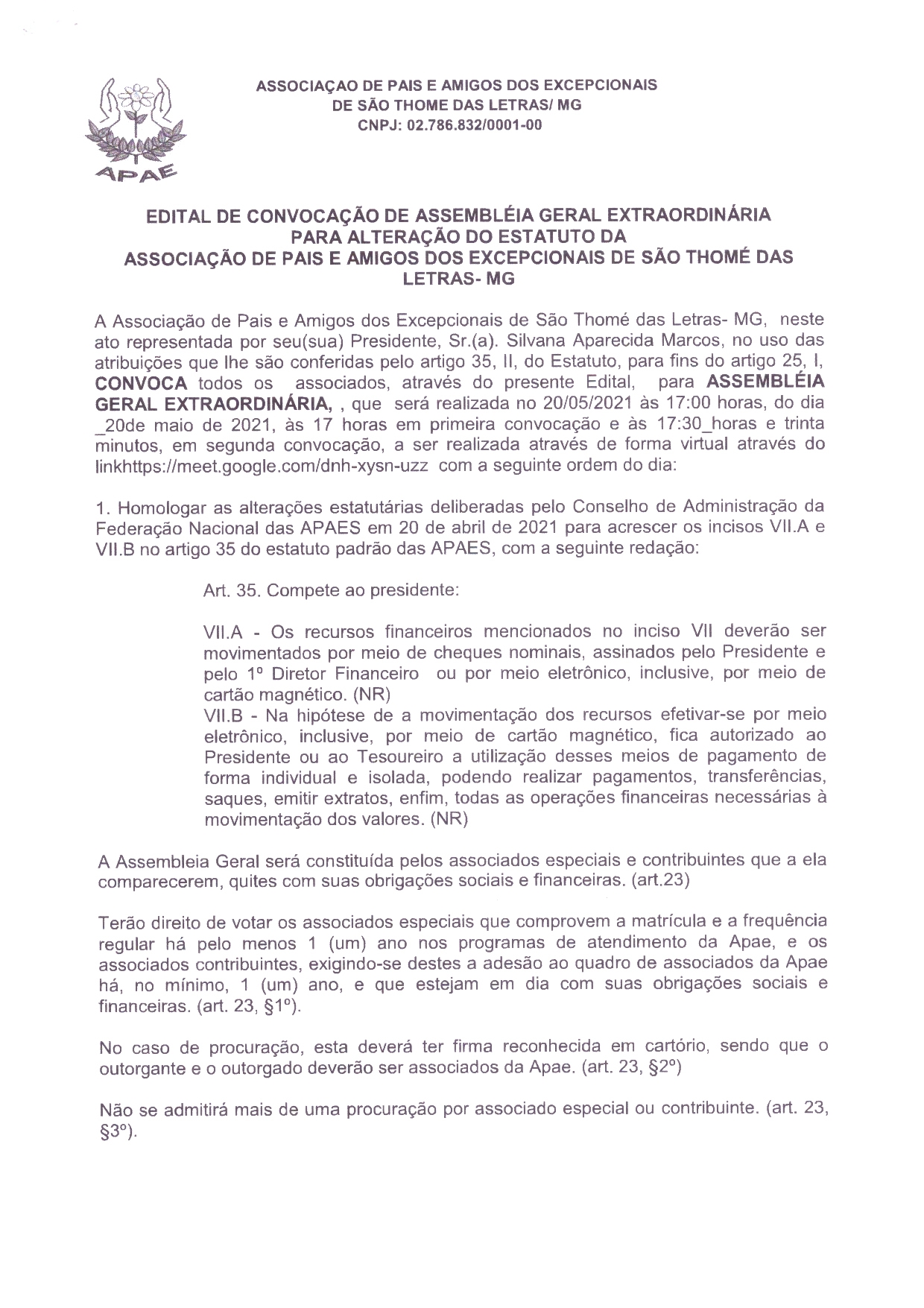 A Associação de Pais e Amigos dos Excepcionais de São Thomé Das Letras (APAE), neste ato representada por seu (sua) presidente, Sr.(a). Silvana Aparecida Marcos, no uso das Atribuições que lhe são conferidas pelo art. 35, II, do Estatuto, para fins do artigo 25,I, Convoca Todos os Associados ,através do presente Edital, para Assembléia Geral Extraordinária, que será realizada na 20-05-2021 às 17:00 horas, do dia 20 de maio de 2021 (Quinta-feira) às 17 horas em primeira convocação e às 17:30 a segunda convocação, a ser realizada de forma virtual no link: