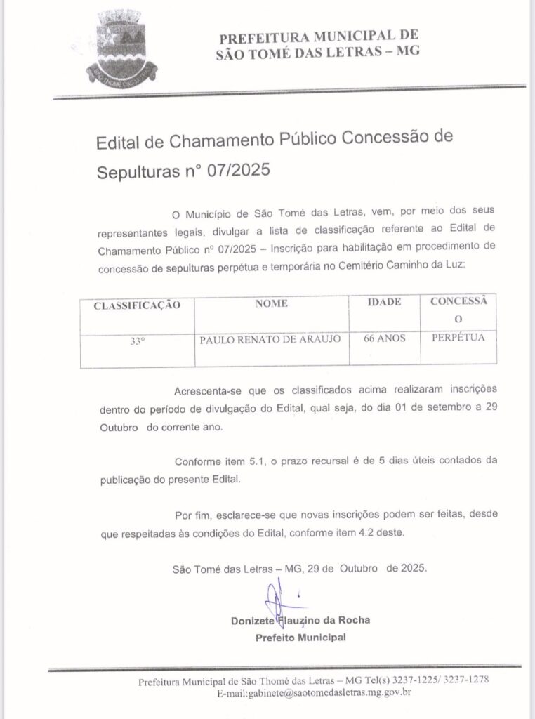 EDITAL DE CHAMAENTO PÚBLICO CONCESSÃO DE SEPULTURAS Nº 07/2025
