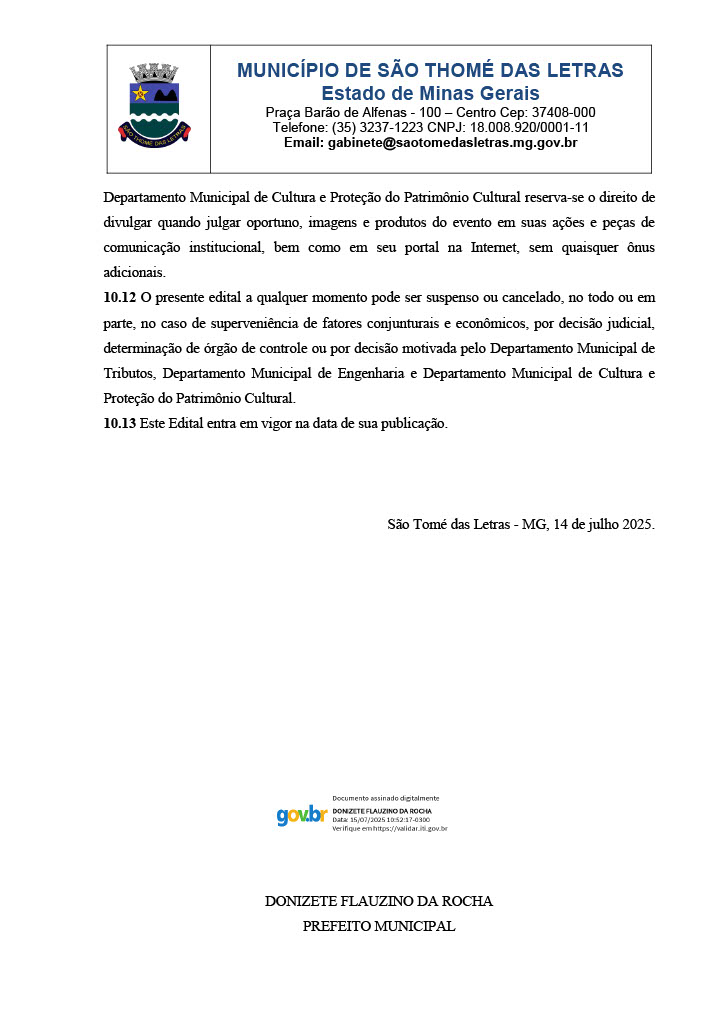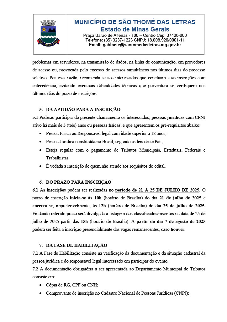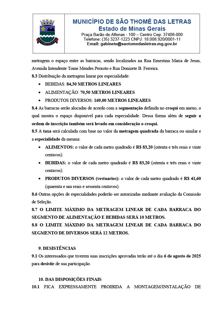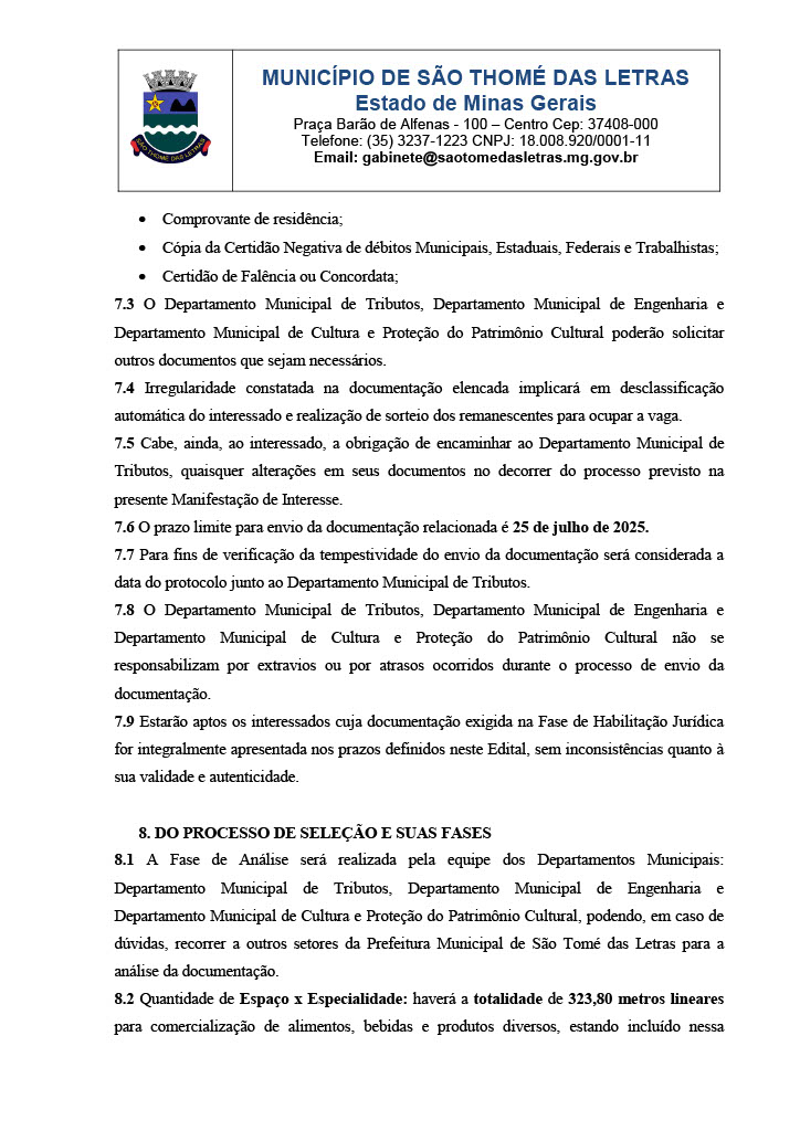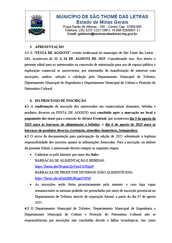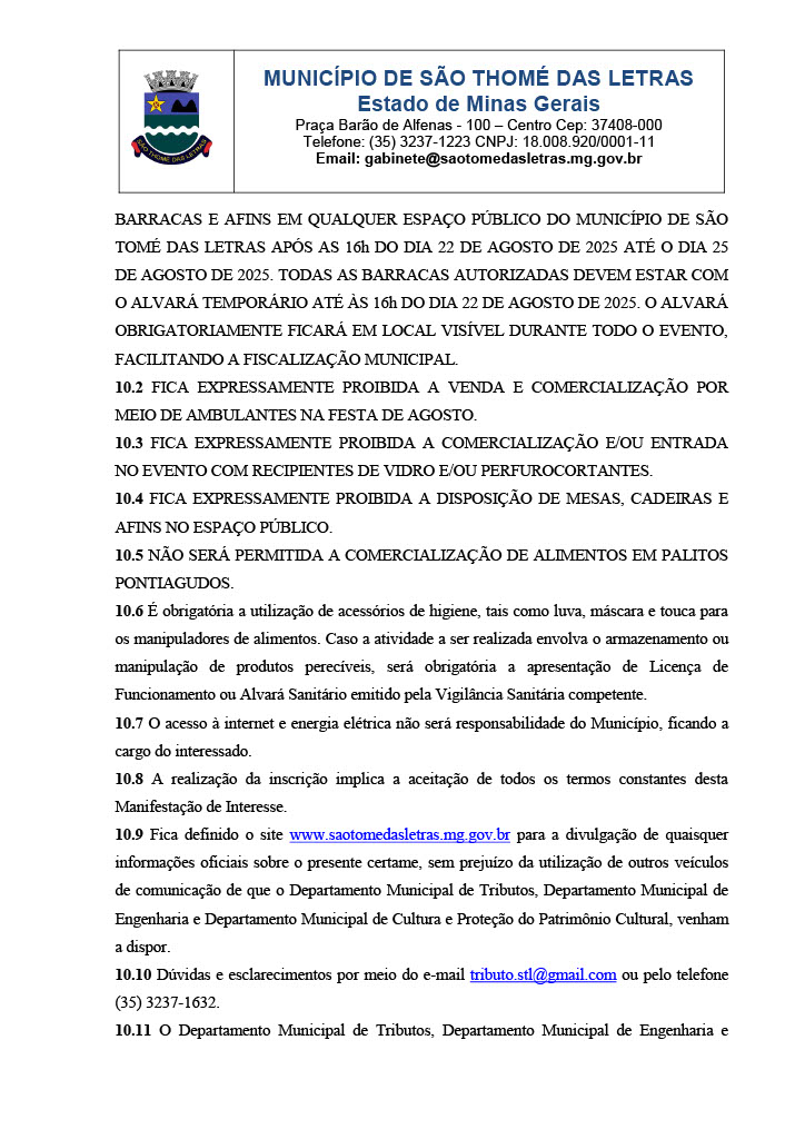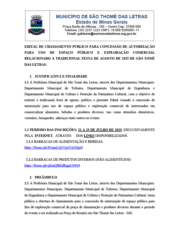 EDITAL DE CHAMAMENTO PÚBLICO PARA CONCESSÃO DE AUTORIZAÇÃO PARA USO DE ESPAÇO PÚBLICO E EXPLORAÇÃO COMERCIAL RELACIONADO À TRADICIONAL FESTA DE AGOSTO 2025 DE SÃO THOMÉ DAS LETRAS