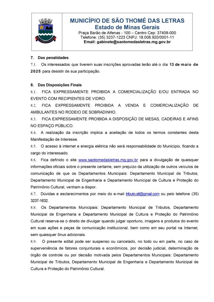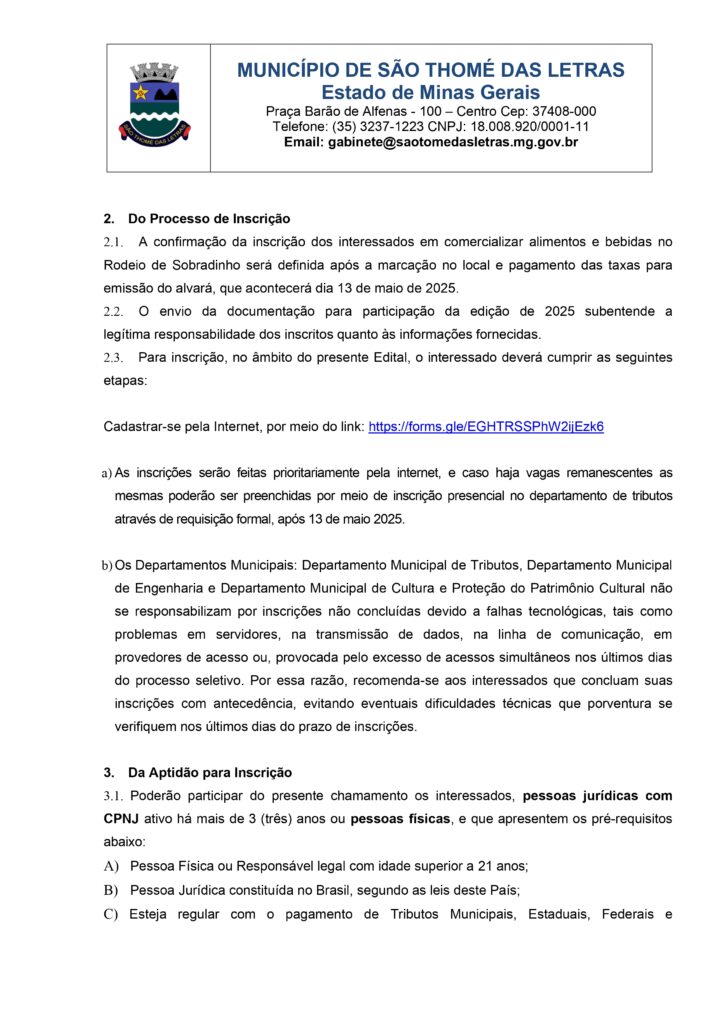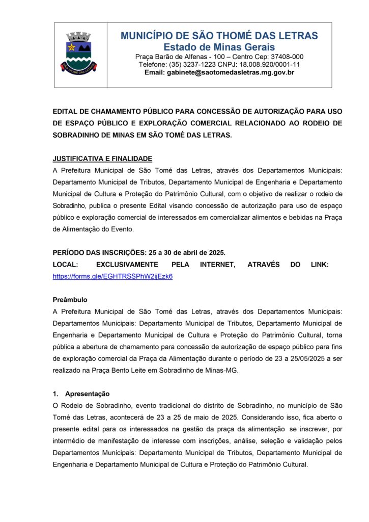 EDITAL DE CHAMAMENTO PÚBLICO PARA CONCESSÃO DE AUTORIZAÇÃO PARA USO DE ESPAÇO PÚBLICO E EXPLORAÇÃO COMERCIAL RELACIONADO AO RODEIO DE SOBRADINHO DE MINAS EM SÃO TOMÉ DAS LETRAS. Início / Notícia / INSCRIÇÕES A PARTIR DE SEXTA 25/04 ÀS 10H DA MANHÃ PELO LINK: https://forms.gle/EGHTRSSPhW2ijEzk6 BAIXE AQUI O EDITAL_CHAMAMENTO_PUBLICO_EM_PDF_assinado-1Baixar