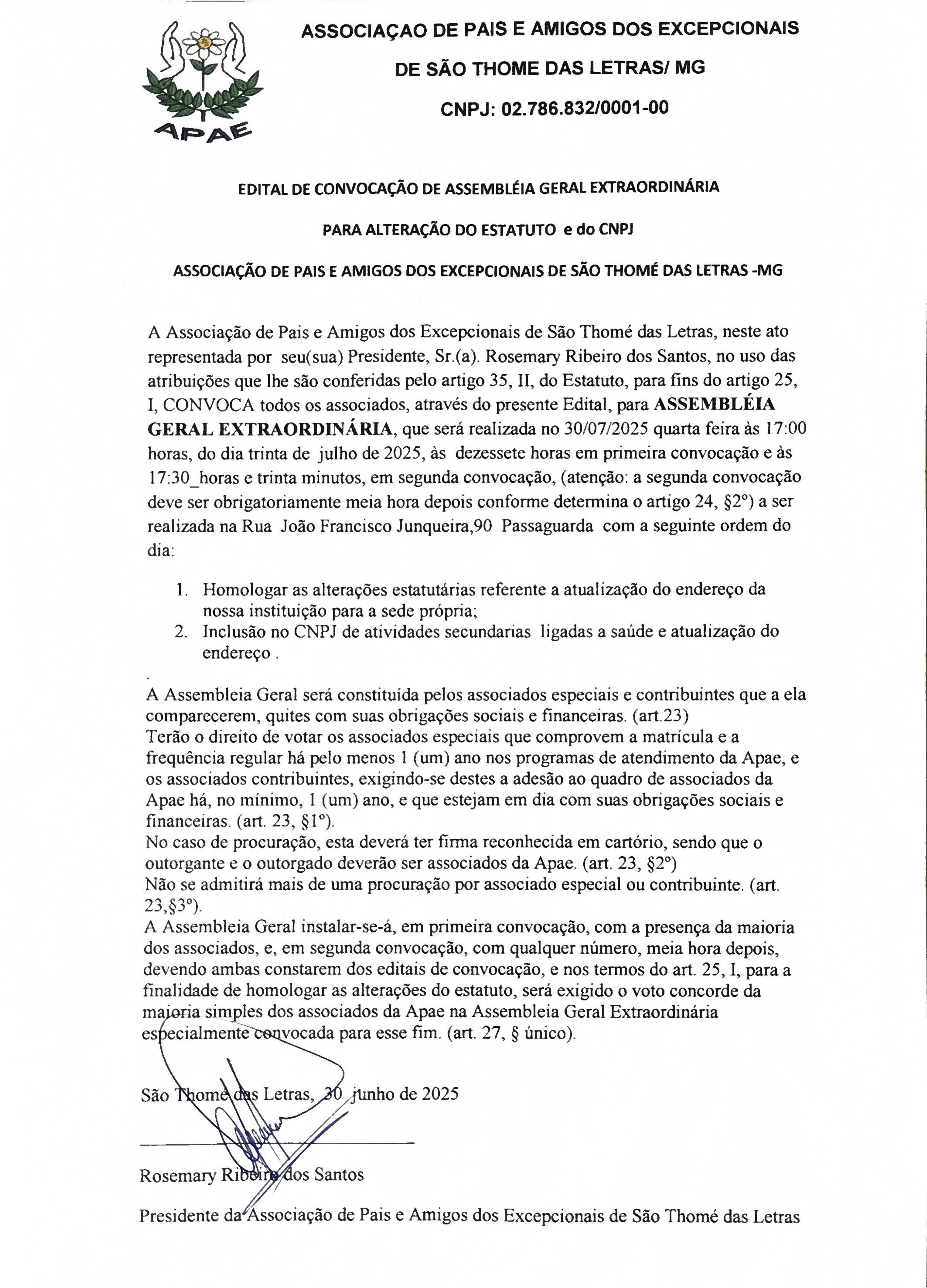 EDITAL DE CONVOCAÇÃO DE ASSEMBLEIA GERAL EXTRAORDINÁRIA PARA ALTERAÇÃO DO ESTATUTO E DO CNPJ Início / Notícia /