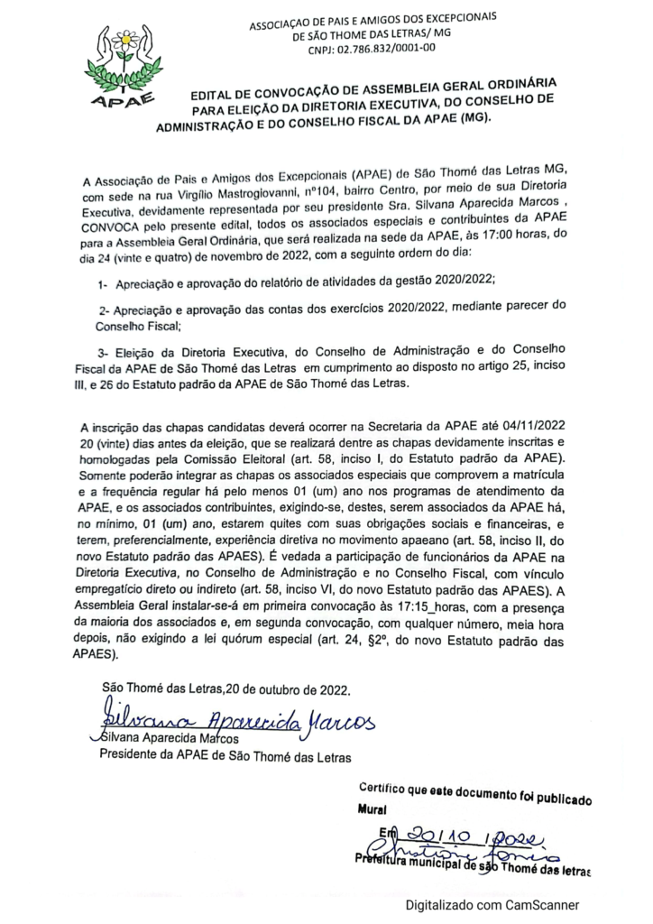 EDITAL DE CONVOCAÇÃO DE ASSEMBLEIA GERAL ORDINÁRIA PARA ELEIÇÃO DA DIRETORIA EXECUTIVA, DO CONSELHO DE ADMINISTRAÇÃO E DO CONSELHO FISCAL DA APAE SÃO THOMÉ Início / Notícia /