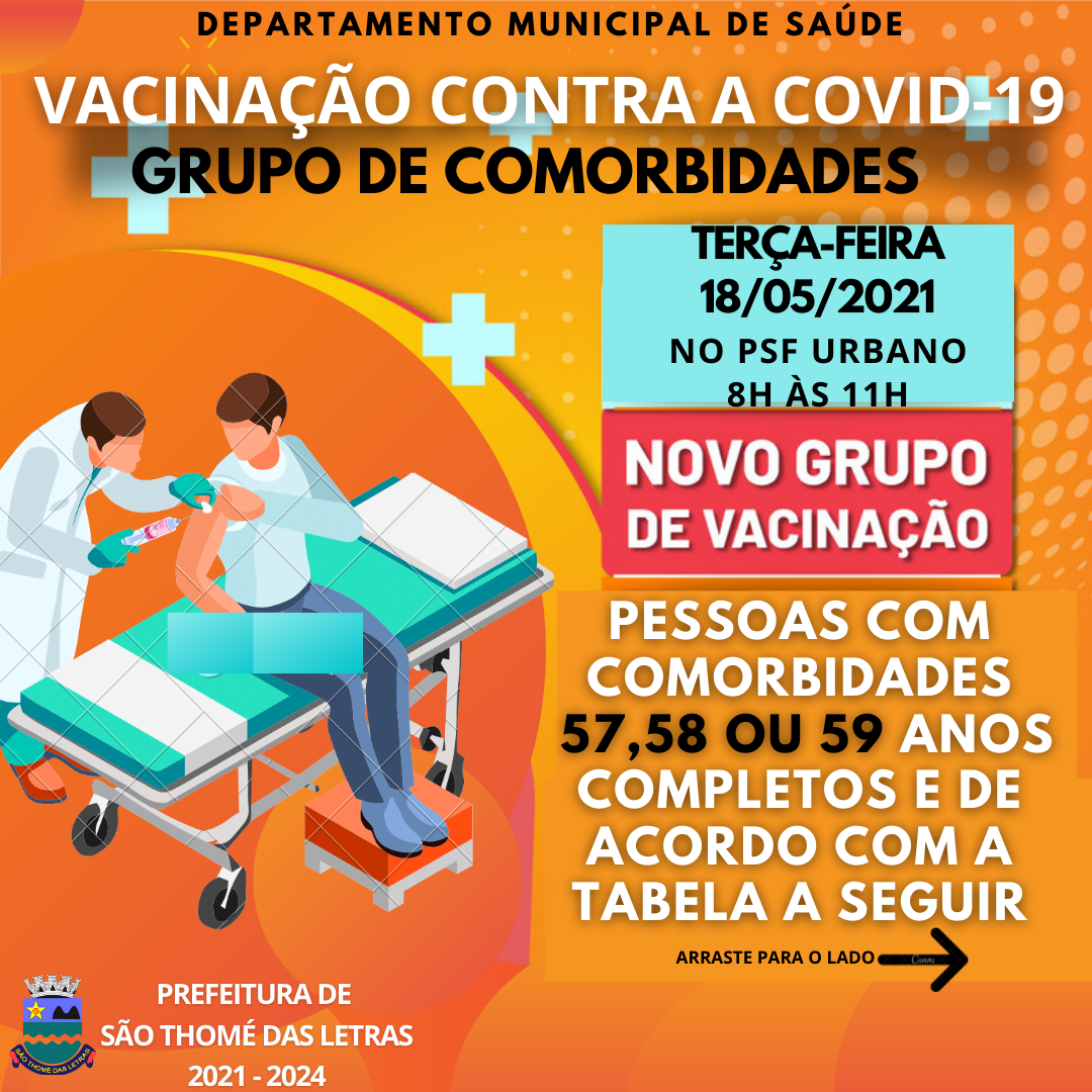 GRUPO DE PACIENTES COM COMORBIDADES DE 57 A 59 ANOS SERÃO VACINADOS CONTRA A COVID-19 NESTA TERÇA-FEIRA EM SÃO THOMÉ DAS LETRAS.