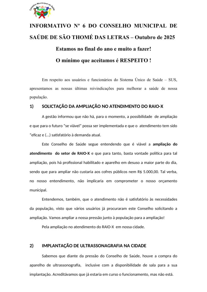 INFORMATIVO Nº6 DO CONSELHO MUNICIPAL DE SAÚDE DE SÃO THOMÉ DAS LETRAS – OUTUBRO DE 2025 Início / Notícia / INFORMATIVO Nº 6 DO CONSELHO MUNICIPAL DE SAÚDE DE SÃO THOMÉ DAS LETRASBaixar