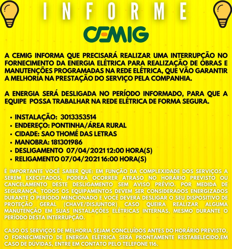 INFORME CEMIG – DESLIGAMENTO NO DIA 07/04/2021 NO BAIRRO PONTINHA PARA REPARO NA REDE ELÉTRICA. Início / Notícia /