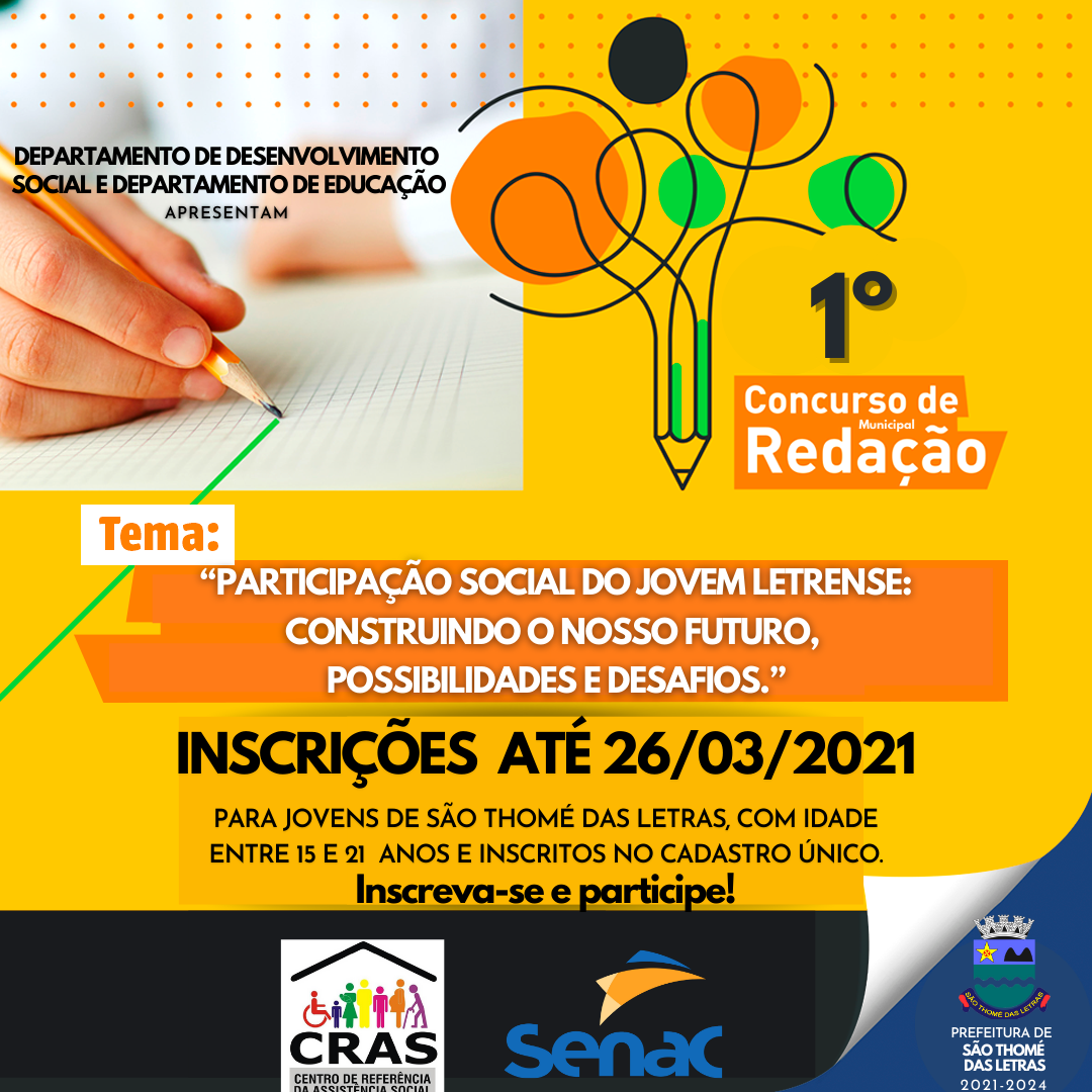 FAÇA JA SUA INSCRIÇÃO PARA O 𝟭º 𝗖𝗢𝗡𝗖𝗨𝗥𝗦𝗢 𝗠𝗨𝗡𝗜𝗖𝗜𝗣𝗔𝗟 𝗗𝗘 𝗥𝗘𝗗𝗔𝗖̧Ã𝗢. ATÉ 26/03! Você jovem Letrense de 15 a 21 anos e inscrito no Cadastro Único, não pode perder esta oportunidade de mostrar seu talento e ainda concorrer a prêmios que vão dar um UP no seu futuro, além de reforçar suas qualificações para o mercado de trabalho.