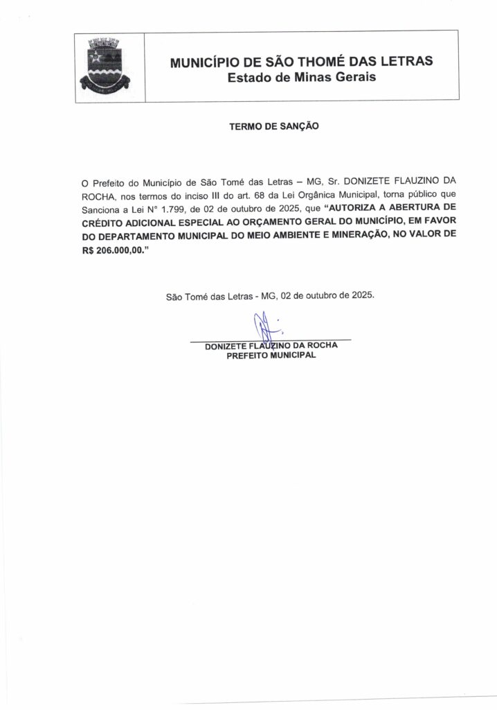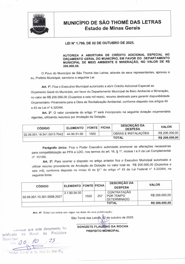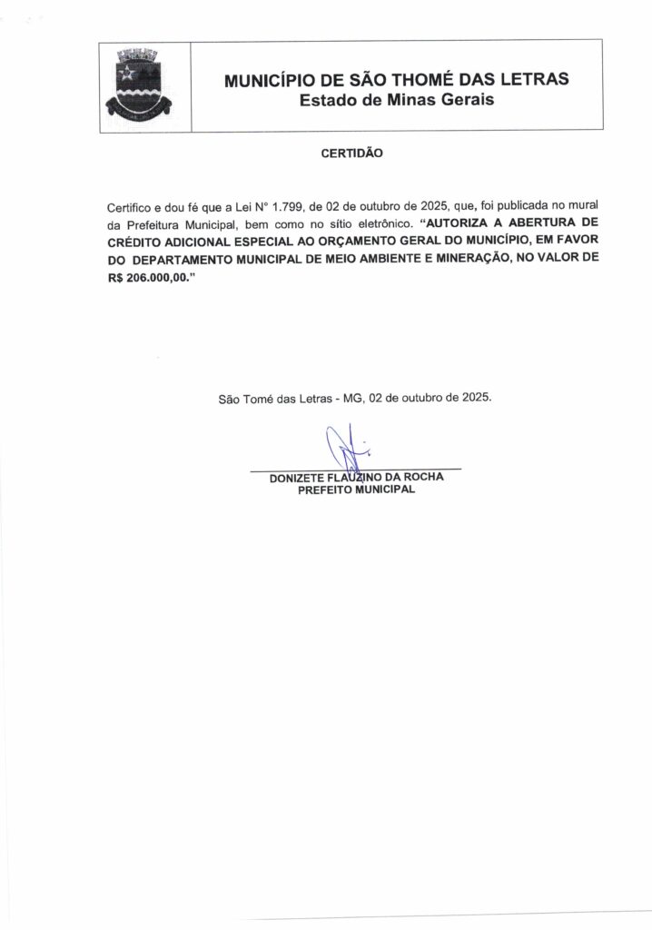 LEI Nº 1.799 DE 2025 AUTORIZA A ABERTURA DE CRÉDITO ADICIONAL ESPECIAL AO ORÇAMENTO GERAL DO MUNICÍPIO EM FAVOR DO DEPARTAMENTO MUNICIPAL DE MEIO AMBIENTE E MINERAÇÃO NO VALOR DE R$ 206.000,00 Início / Notícia /