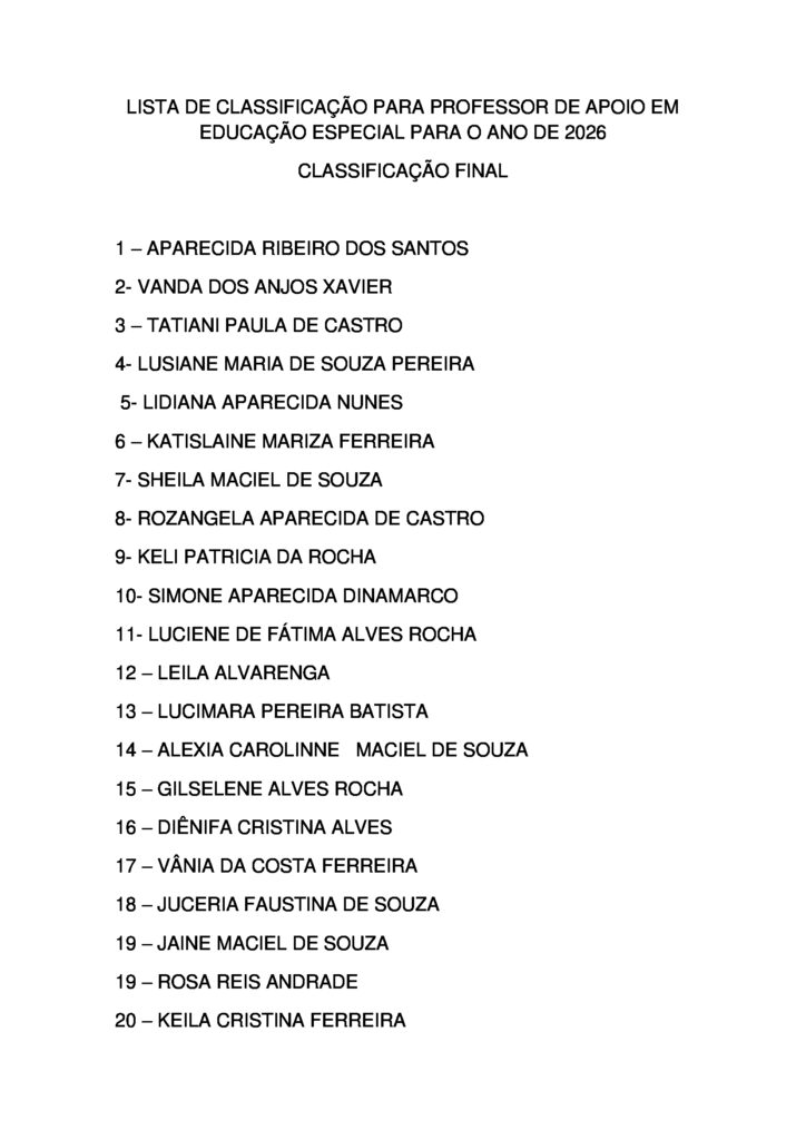 LISTA DE CLASSIFICAÇÃO FINAL PARA PROFESSOR DE APOIO EM EDUCAÇÃO ESPECIAL PARA O ANO 2026 Início / Notícia /