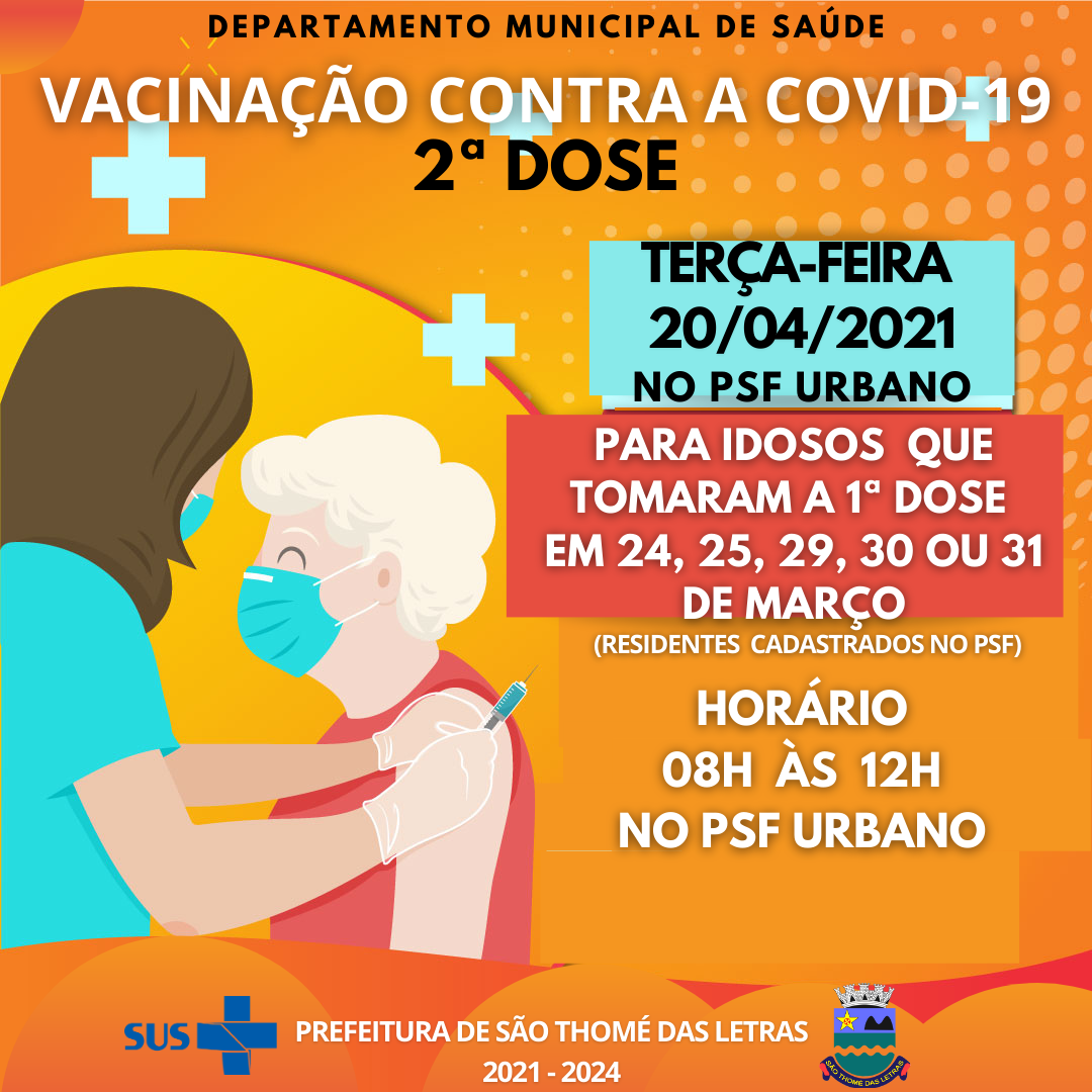 VACINAÇÃO DA 𝗦𝗘𝗚𝗨𝗡𝗗𝗔 𝗗𝗢𝗦𝗘 𝗖𝗢𝗡𝗧𝗥𝗔 𝗔 𝗖𝗢𝗩𝗜𝗗-𝟭𝟵| #CORONAVAC| ATENÇÃO FAMILIARES, NÃO ESQUEÇAM DE LEVAR O VOVÔ OU A VOVÓ. – O Departamento Municipal de Saúde convida a todos residentes/cadastrados para receberem a 𝗦𝗘𝗚𝗨𝗡𝗗𝗔 dose da vacina contra a covid-19.