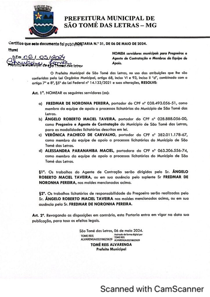 NOMEAÇÃO DE SERVIDORES MUNICIPAIS PARA PREGOEIROS – AGENTE DE CONTRATAÇÃO E MEMBROS DA EQUIPE DE APOIO
