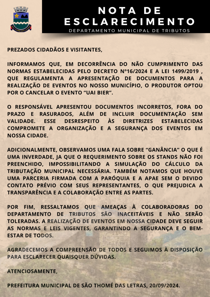 NOTA DE ESCLARECIMENTO SOBRE O CANCELAMENTO DO “UAI BIER 2024”