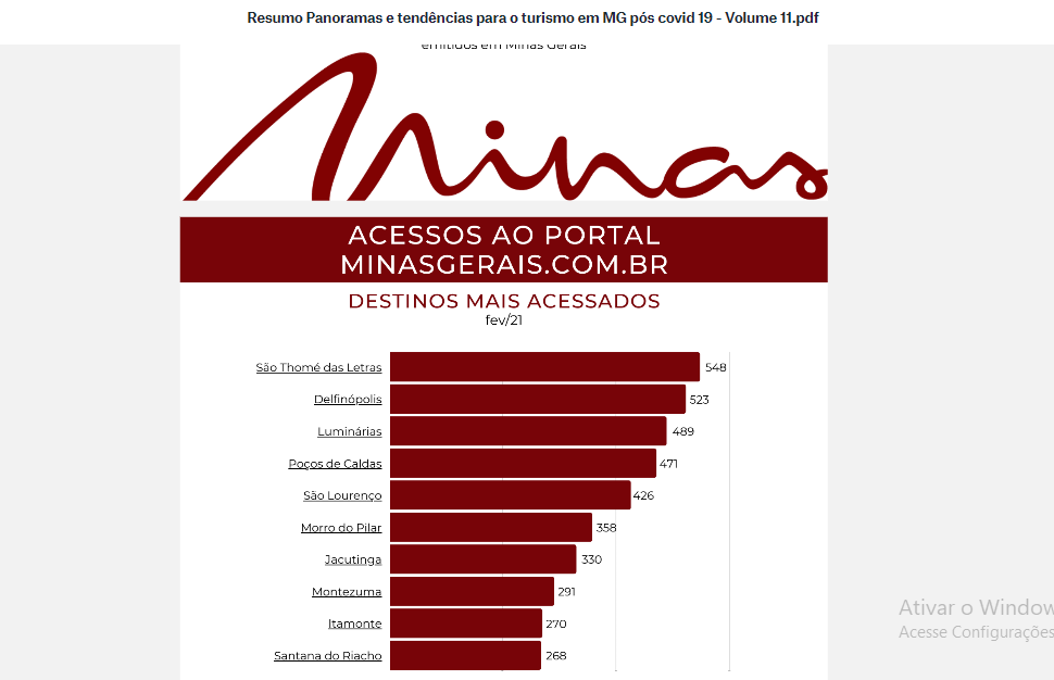 RELATÓRIO: O documento visa contribuir para melhor compreensão da conjuntura e para a construção e desenvolvimento de estratégias mais assertivas, passando por atualizações periódicas para acompanhamento das rápidas mudanças de cenário. O documento possui duas versões que podem ser acessadas, a completa e a resumida. Confira completo no link a seguir 📍 https://www.dropbox.com/sh/91nehyo9y1ff1nl/AADtHSq1nmbMQPHD6VuYmNoWa?dl=0&preview=Panoramas+e+tend%C3%AAncias+para+o+turismo+em+MG+p%C3%B3s+covid+19+-+Volume+11.pdf e no 📍https://www.observatorioturismo.mg.gov.br/?p=8084