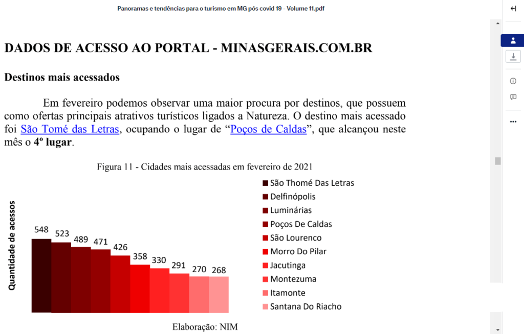 A chefe do Departamento Municipal de Turismo, Carla Gonzalez e equipe, receberam com alegria o relatório dos 3 primeiros meses de 2021 do Observatório do Turismo de Minas Gerais. Os relatórios ‘Panoramas e Tendências para o Turismo em Minas pós covid-19’ contém indicadores e análises do cenário atual e as perspectivas para o setor. Em fevereiro podemos observar (VIDE ANEXO ABAIXO) uma maior procura por destinos, que possuem como ofertas principais os atrativos turísticos ligados a Natureza e o destino mais acessado foi São Thomé das Letras. Para o Departamento de Turismo é uma honra ter a cidade como alvo no setor e o constante crescimento na busca por destinos turísticos pós-pandemia.