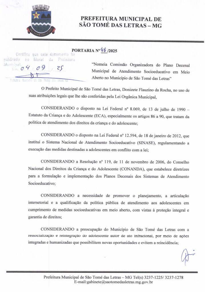 PORTARIA 46 – NOMEIA COMISSÃO ORGANIZADORA DO PLANO DECENAL MUNICIPAL DE ATENDIMENTO SOCIOEDUCATIVO EM MEIO ABERTO NO MUNICÍPIO DE SÃO THOMÉ DAS LETRAS Início / Notícia /