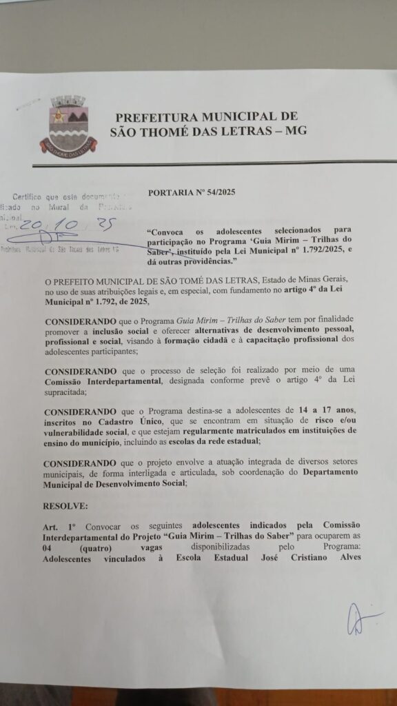 PORTARIA 54/2025 CONVOCA OS ADOLESCENTES SELECIONADOS PARA PARTICIPAÇÃO NO PROGRAMA “GUIA MIRIM” TRILHAS DO SABER, INSTITUÍDO PELA LEI MUNICIPAL 1792/2025 Início / Notícia /