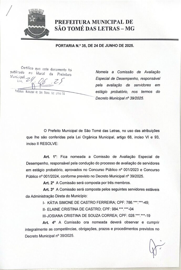 PORTARIA Nº 35 DE 24/06/2025 NOMEIA A COMISSÃO DE AVALIAÇÃO ESPECIAL DE DESEMPENHO, RESPONSÁVEL PELA AVALIAÇÃO DE SERVIDORES EM ESTÁGIO PROBATÓRIO NOS TERMOS DO DECRETO MUNICIPAL 39/2025 Início / Notícia /