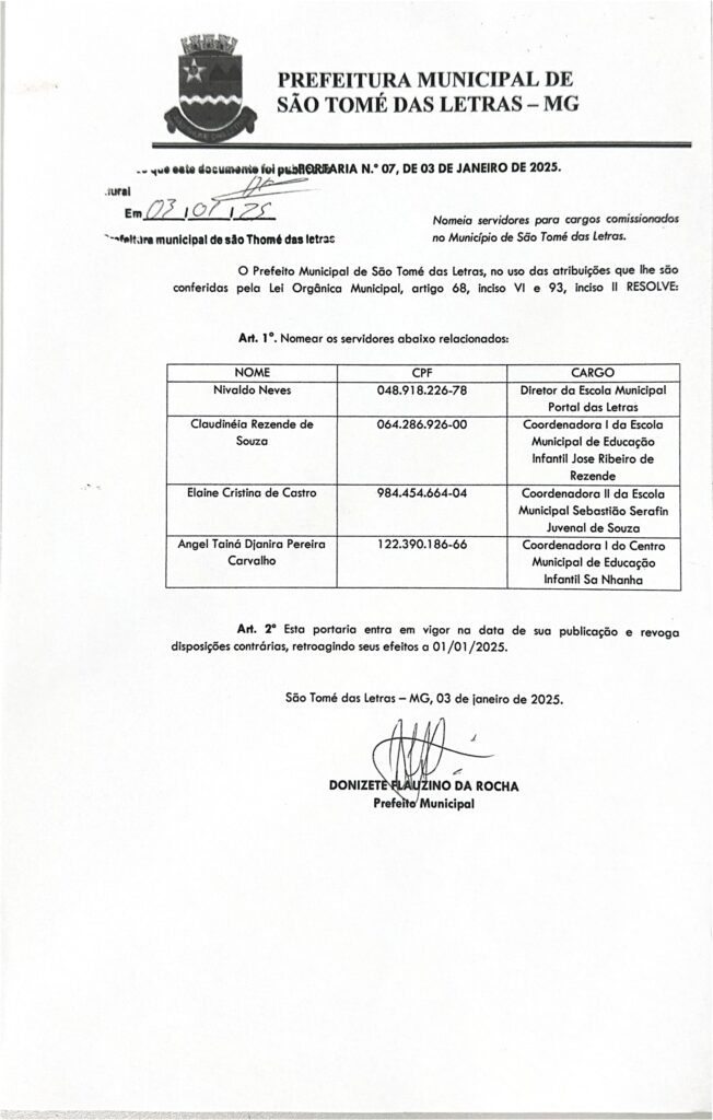Portaria número 07 – de 03 de Janeiro de 2025 – NOMEIA SERVIDORES PAR CARGOS COMISSIONADOS DE SÃO THOMÉ DAS LETRAS Início / Notícia /