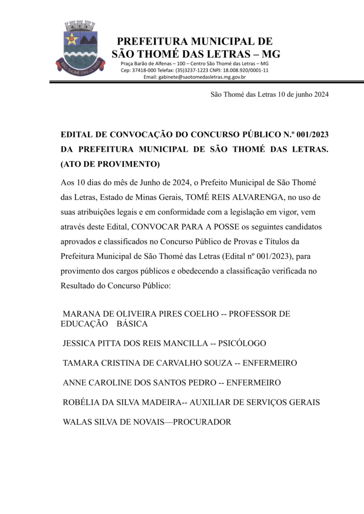 O Departamento de Recursos Humanos do Município de São Thomé das Letras-MG e o Prefeito Municipal, TOMÉ REIS ALVARENGA, conforme previsto no Edital 001/2023, CONVOCA 4ª REMESSA PARA POSSE EM CARGO EFETIVO DO MUNICÍPIO DE SÃO THOMÉ DAS LETRAS-MG, PROVENIENTE DO CONCURSO PÚBLICO 001/2023: