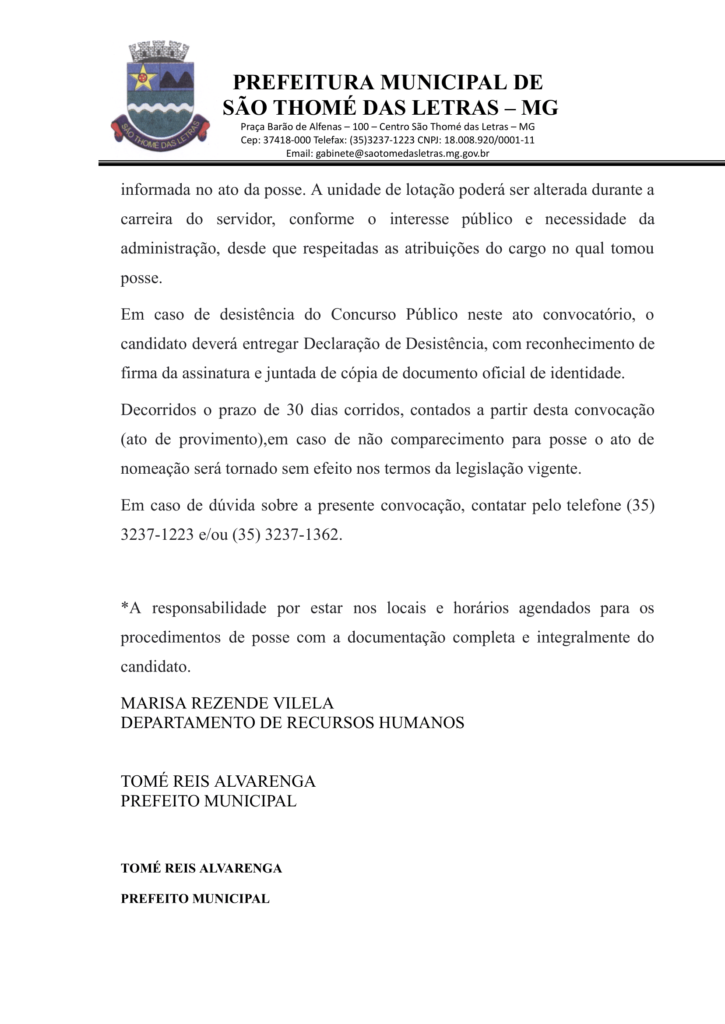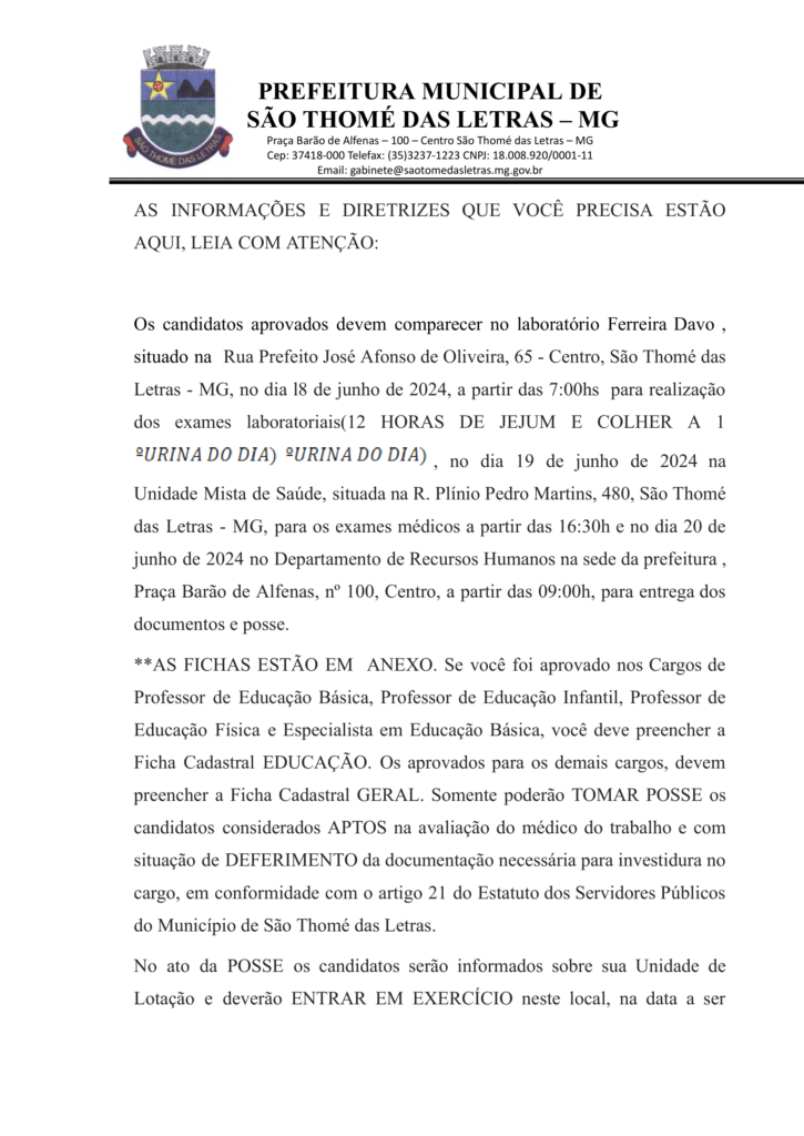 PREFEITURA CONVOCA 4ª REMESSA DE SERVIDORES APROVADOS NO CONCURSO PÚBLICO DA PREFEITURA DE SÃO THOMÉ DAS LETRAS