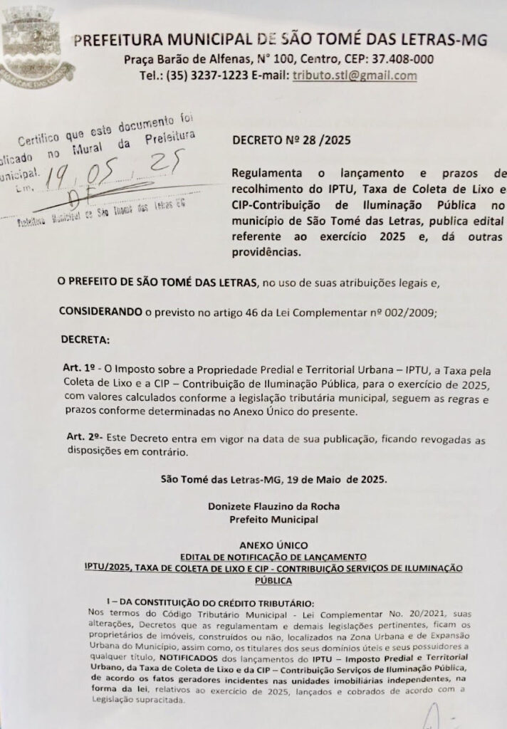 REGULAMENTO O LANÇAMENTO E PRAZOS DE RECOLHIMENTO DO IPTU – TAXA DE COLETA DE LIXO E CIP/CONTRIBUIÇÃO DE ILUMINAÇÃO PÚBLICA NO MUNICÍPIO DE SÃO THOMÉ DAS LETRAS PUBLICA EDITAL REFERENTE AO EXERCÍCIO 2025 E DÁ OUTRAS PROVIDÊNCIAS Início / Notícia /