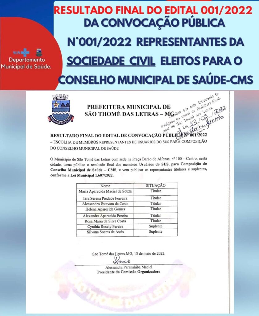 📄📌A Prefeitura do Município de São Thomé das Letras, torna pública para conhecimento dos interessados, o resultado da Convocação Pública, objetivando a Escolha de Membros representantes da sociedade civil, para Composição do Conselho Municipal de Saúde, nos termos previstos no edital 001/2022