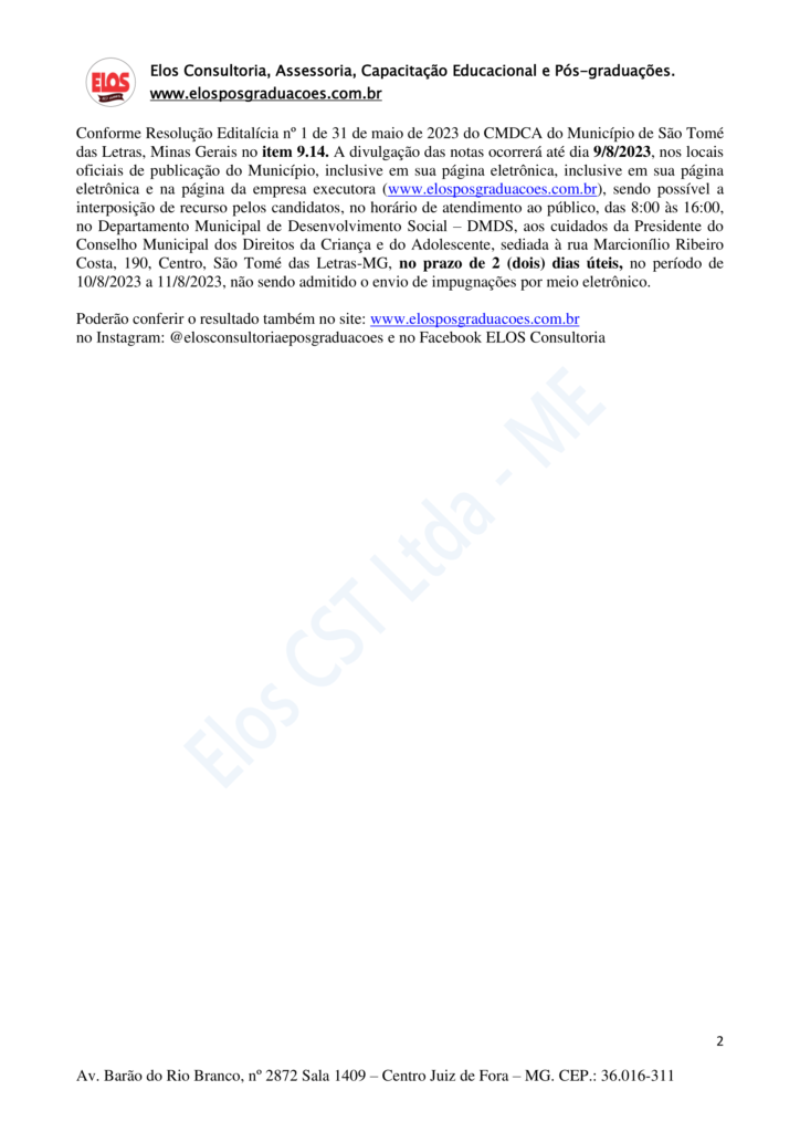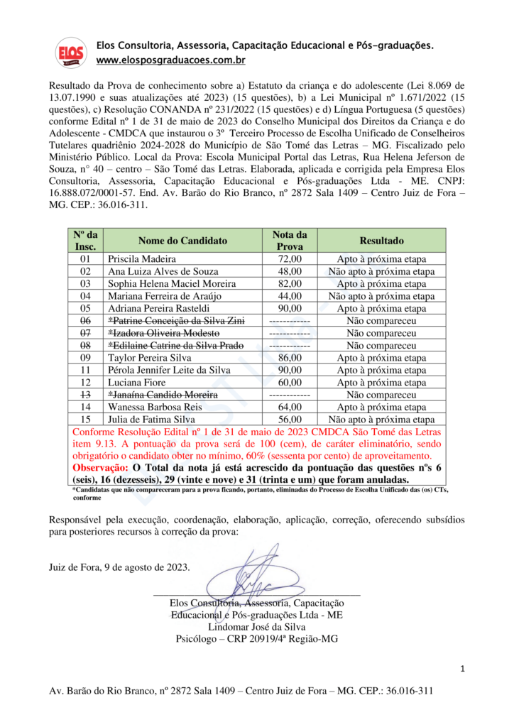 RESULTADO DA PROVA DE CONHECIMENTOS ESPECÍFICOS PARA O CONSELHO TUTELAR DE SÃO THOMÉ DAS LETRAS 2023 Início / Notícia /
