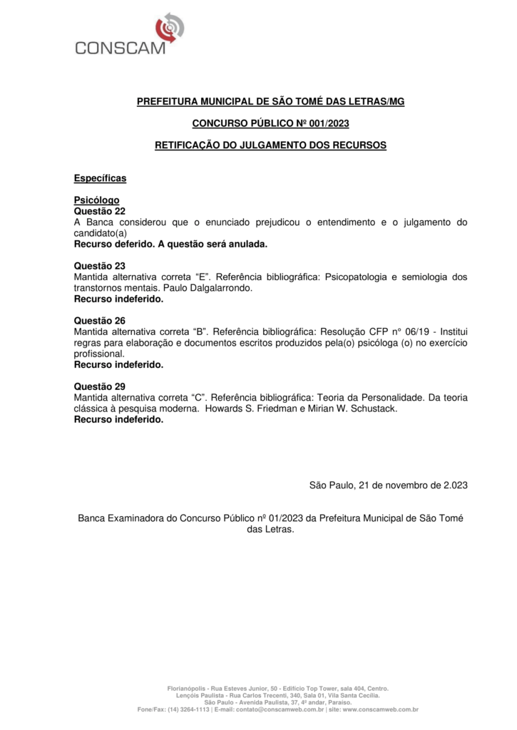 RETIFICAÇÃO DO JULGAMENTO DOS RECURSOS DA PROVA ESPECÍFICA DE PSICÓLOGO – CONCURSO PÚBLICO 2023 SÃO THOMÉ DAS LETRAS Início / Notícia /