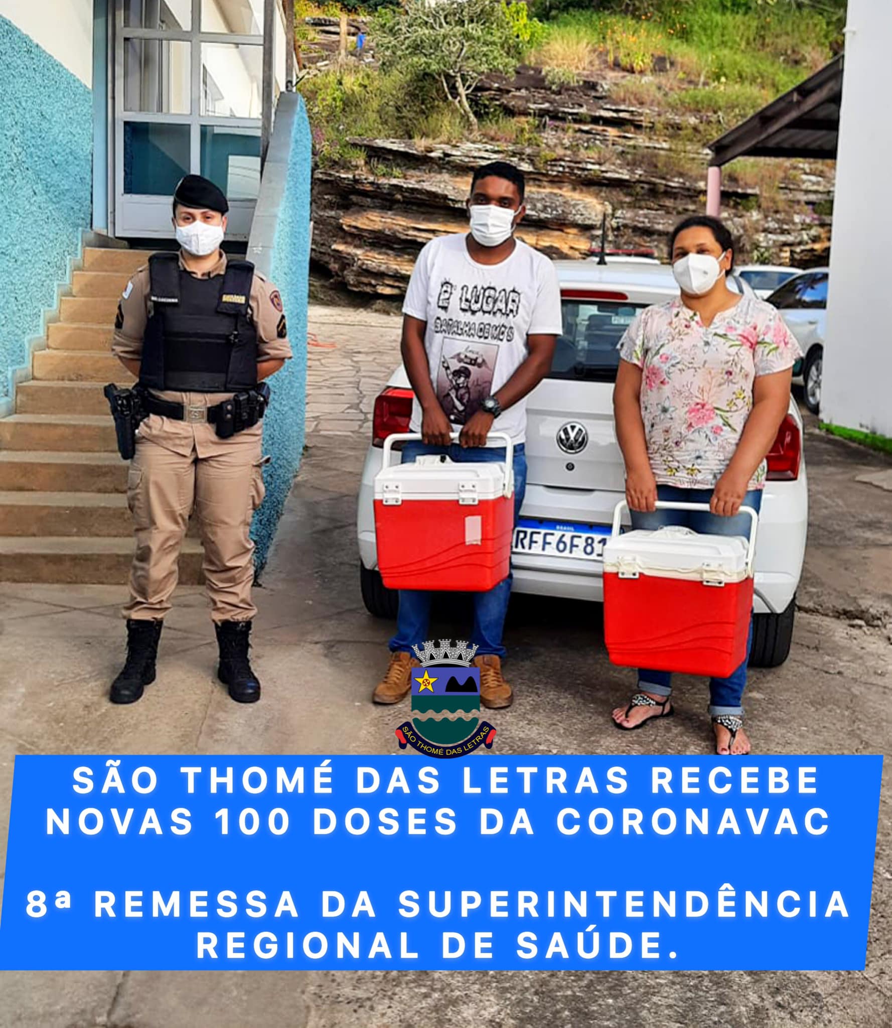 O Departamento Municipal de Saúde recebeu na sexta-feira (26) na Superintendência Regional de Saúde em Varginha, a 8ª remessa de distribuição; foram entregues 100 doses da CORONAVAC, vacina contra a covid-19.