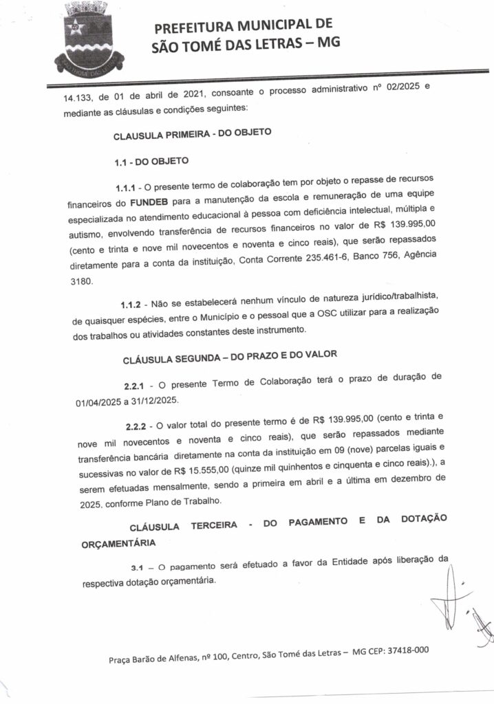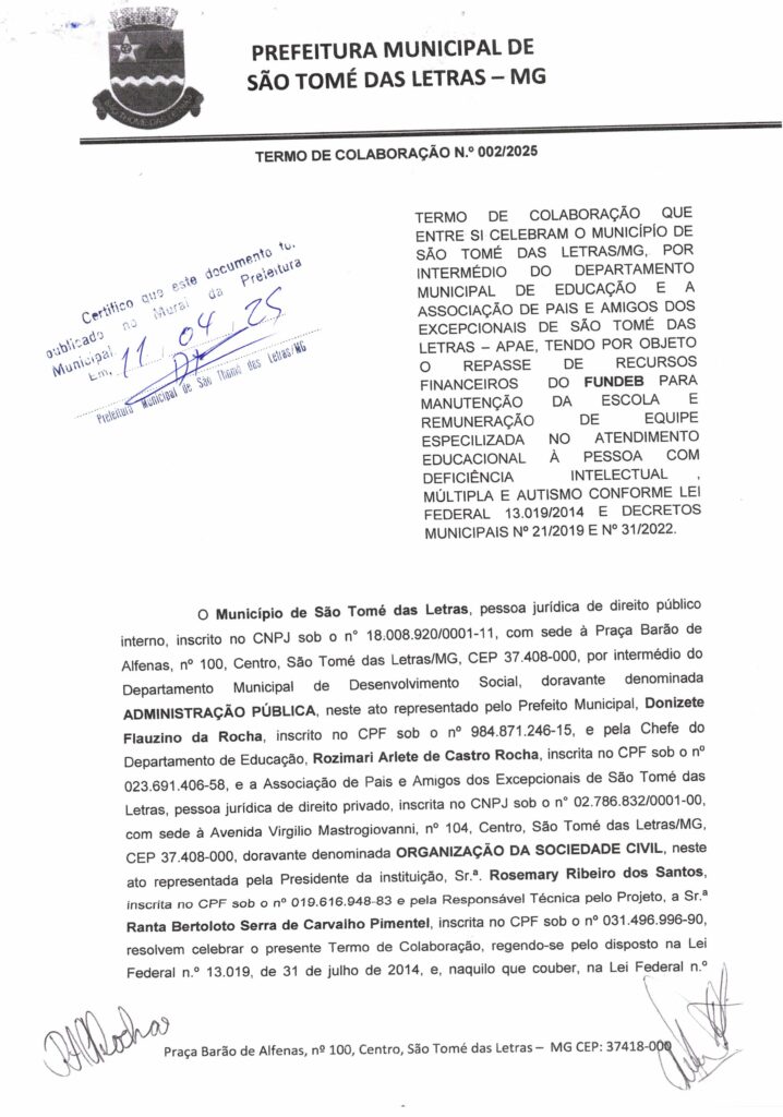 TERMO DE COLABORAÇÃO N003/2025 QUE ENTRE SI CELEBRAM MUNICÍPIO POR INTERMÉDIO DO DEPARTAMENTO DE EDUCAÇÃO E APAE TENDO COMO OBJETO O REPASSE DE RECURSOS FINANCEIROS DO FUNDEB PARA MANUTENÇÃO DA ESCOLA E REMUNERAÇÃO DA EQUIPE ESPECIALIZADA NO ATENDIMENTO EDUCACIONAL À PESSOA COM DEFICIÊNCIA INTELECTUAL MÚLTIPLA E AUTISMO CONFORME A LEI FEDERAL 13.019/2014 E DECRETOS MUNICIPAIS 21/2019 E 31/2022