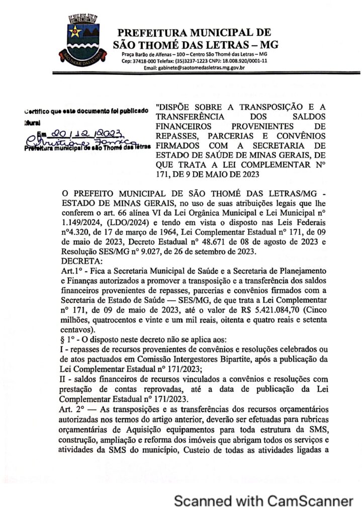 TRANSPOSIÇÃO E A TRANSFERÊNCIA DOS SALDOS FINANCEIROS PROVENIENTES DE REPASSES, PARCERIAS E CONVÊNIOS FIRMADOS COM A SECRETARIA DE ESTADO DE SAÚDE DE MINAS GERAIS DE QUE TRATA A LEI COMPLEMENTAR 171/ DE 09/05/2023