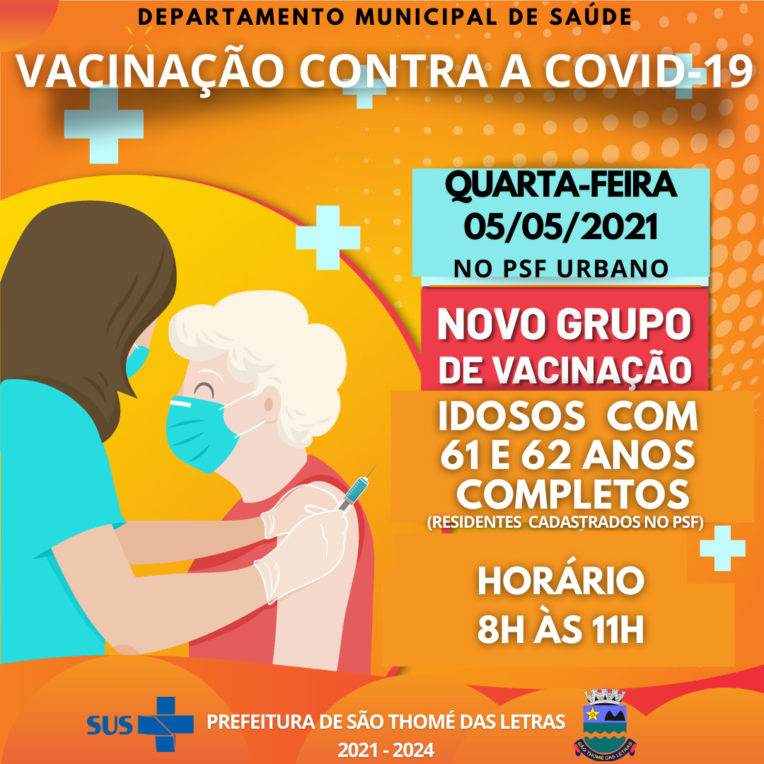 O Departamento Municipal de Saúde convida a todos residentes/cadastrados e com 61 ou 62 anos completos, para receberem a dose da vacina contra a covid-19. A vacinação no município está ocorrendo de acordo com o Plano Nacional de Imunização (PNI). No momento da vacinação, os idosos devem portar o RG ou documento com foto, Cartão de vacina e do SUS e o comprovante de residência.