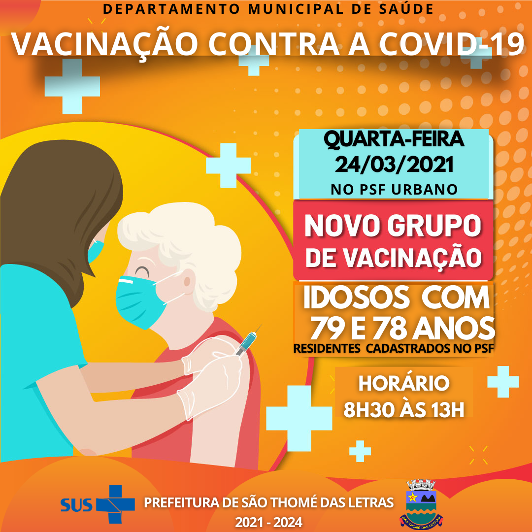 A VACINAÇÃO PARA IDOSOS DE 79 e 78 anos QUE ESTÁ ACONTECENDO HOJE, QUARTA-FEIRA. O Departamento Municipal de Saúde convida a todos residentes/cadastrados para receberem as doses da CORONAVAC, vacina contra a covid-19. A vacinação no município está ocorrendo de acordo com o Plano Nacional de Imunização (PNI). No momento da vacinação, os idosos (78 e 79 anos) devem portar o Cartão de Vacina, RG ou documento com foto, CPF, número do Cartão do SUS e o comprovante de residência.
